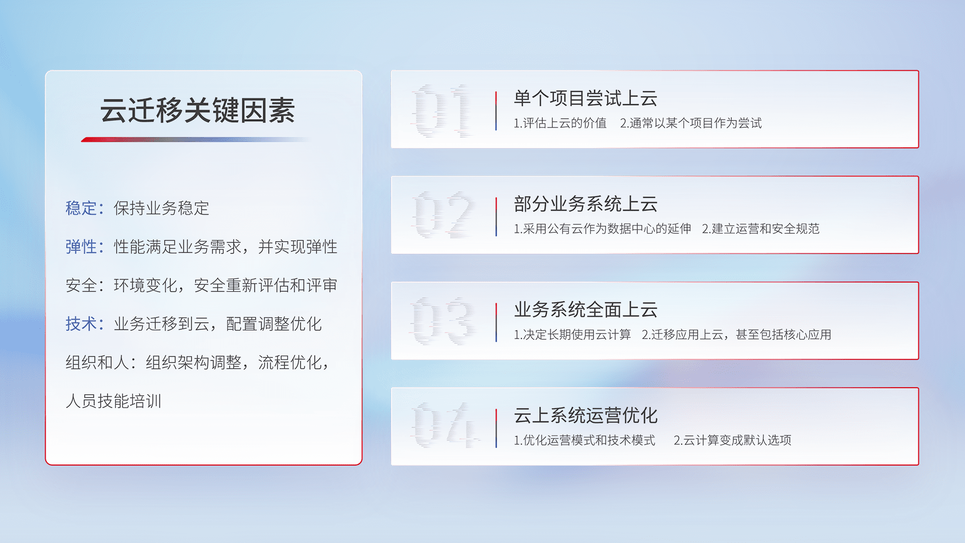 结合实际业务,,,,从规划设计、、、、云平台选型、、云原生改造、、、数据迁移、、、集成交付,,迁移全过程为客户识别最佳上云路径,,,,做好风险识别管理,,,,设计网络架构、、、、身份权限、、安全审计合规、、、、操作审计、、日志审计、、监控告警策略、、多站点容灾设计等,,,,对云上基础设施进行整体规划,,,,提升IT治理水平,,,以满足弹性、、高可用、、、高性能的需求。。